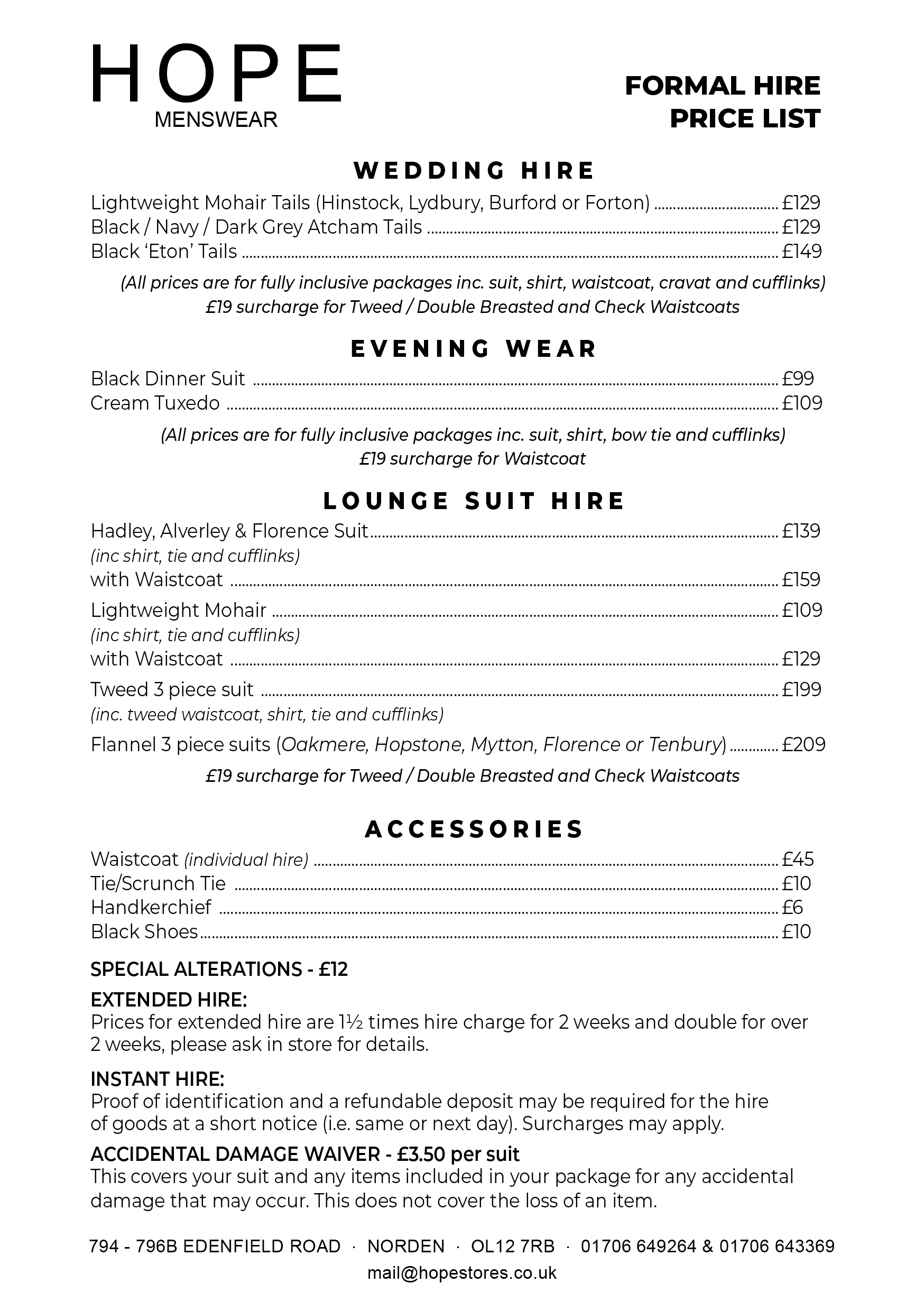 Our DENIS HOPE formal hire department at the Norden store boast a comprehensive range of formal wear for both men and boys. With over 50 years of award winning experience, you will receive individual attention and professional advice. Our staff are on hand to help guide you through all the latest jacket styles, as well as show you our exclusive range of modern and contemporary waistcoats. Fully inclusive hire packages start from £59.